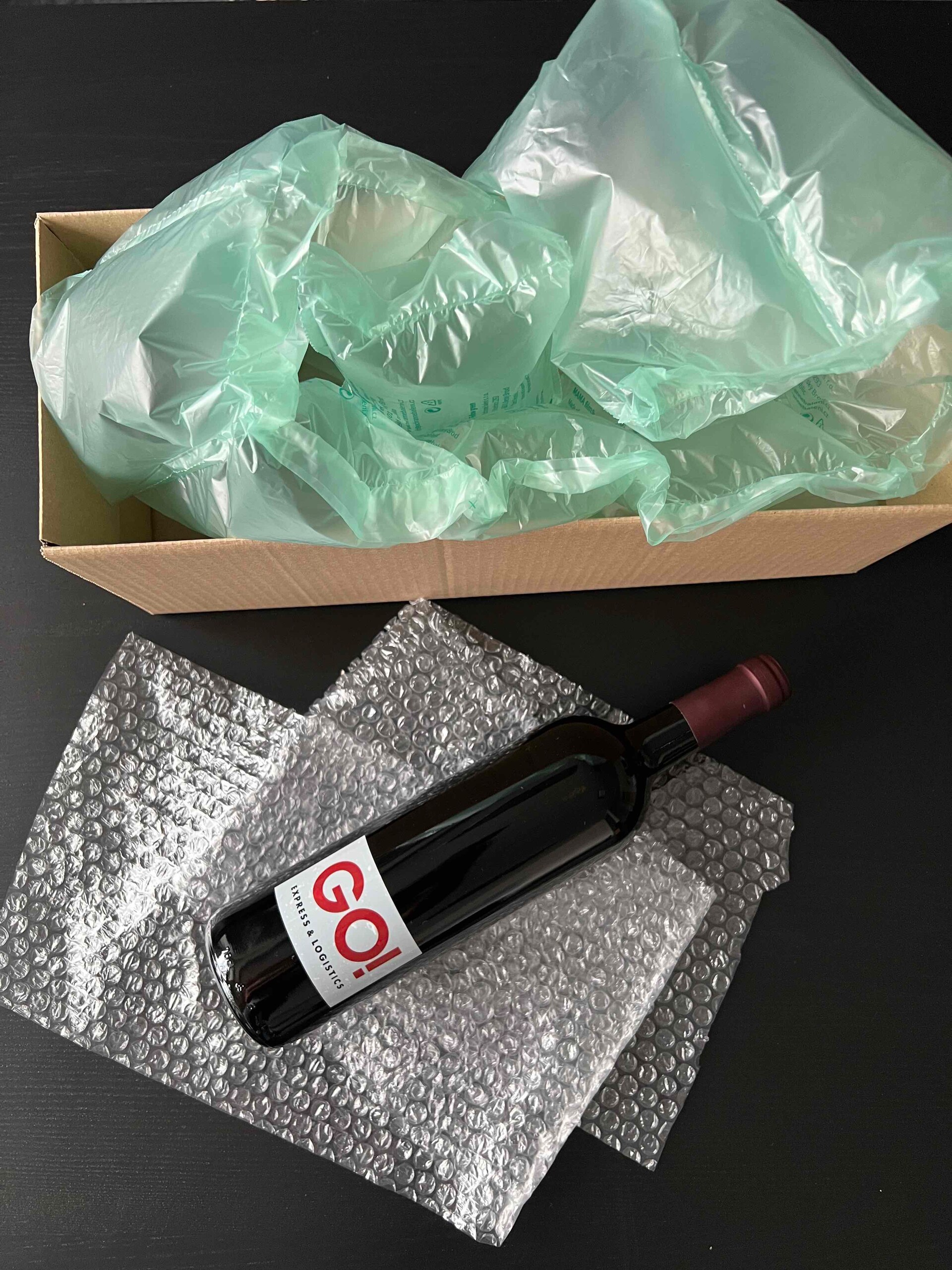 Lahev zabalte do bublinkové folie, ideálně do více vrstev a uložte do krabice. Okolí lahve vyplňte vzduchovými polštářky, papírem nebo polystyrenovými výplněmi. Důležité je, aby se lahev nikde nedotýkala krabice a celý prostor byl zcela zaplněn.