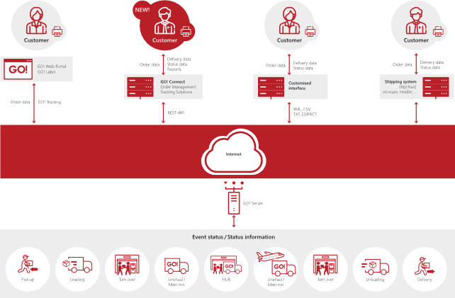 Met behulp van geheel of gedeeltelijk geautomatiseerde interfaceverbindingen kun je snel en eenvoudig je zendingsgegevens naar GO! verzenden zonder handmatige invoer en de bijbehorende statusgegevens ontvangen.